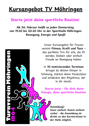 Wir bieten euch einen bunten Mix aus Fitness (Kräftigung, Bauch-Beine-Po,...), Tanz und Gymnastik. Auch Spiele wie z.B. Völkerball, Badminton oder Ähnliches stehen gelegentlich auf dem Programm. Es soll für jeden etwas dabei sein und zu einem netten Beisammensein führen.